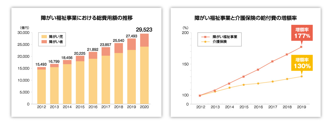 また、障がいサービス費用は9年で1.9倍、介護保険と比較したサービス費用の伸びは2012年を100とした場合1.3倍にもなります。