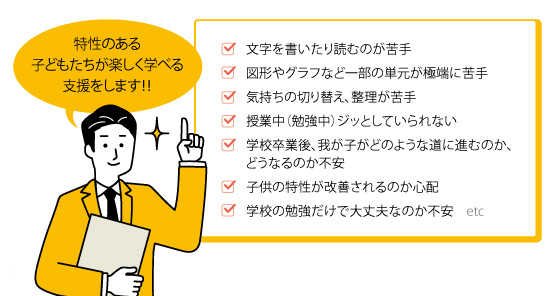 「学習」を入口に、相互の信頼関係を築き、その子らしさを生かして、成功体験を積み、自己肯定感を高めます。成功体験が自己肯定感・自尊心を高め、自分を信頼して「挑戦する心」を育みます。 それは、社会生活で必要な様々なことを学んでいく原動力になると考えています。発達に個性があるだけで、子どもの選択肢が減ってはなりません。違う形で社会に貢献できる仕事です。