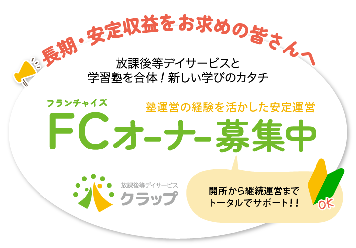 ニーズが増え続ける放課後等デイサービスではありますが、発達障がいなど学習につまづきのある児童への支援は通常の塾で行われている授業とは異なる関わり方が必要となります。 また保険収入を受け取るためには、自治体より指定を受ける必要があります。物件・設備や人員配置の要件を満たし、申請書類提出と煩雑な作業が複数あります。 クラップでは法定の基準を満たし、はじめて福祉事業に参入される方にもしっかりとしたサポート体制を用意しております。